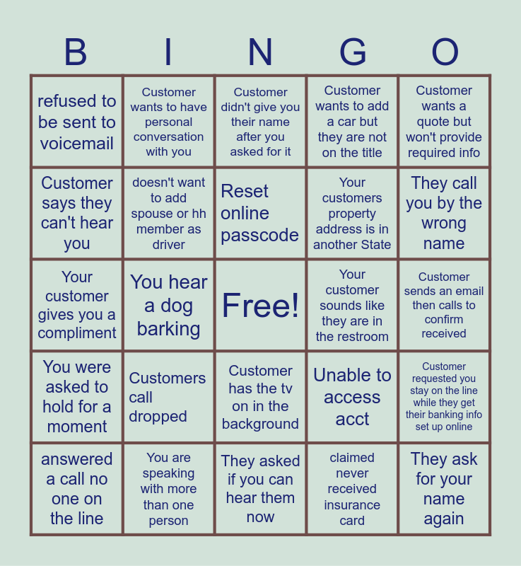 This bingo card has a free space and 24 words: Customers call dropped, You are speaking with more than one person, Reset online passcode, answered a call no one on the line, Customer wants a quote but won't provide required info, refused to be sent to voicemail, Customer says they can't hear you, Customer wants to have personal conversation with you, Your customer sounds like they are in the restroom, Customer has the tv on in the background, Your customers property address is in another State, Your customer gives you a compliment, Unable to access acct, Customer requested you stay on the line while they get their banking info set up online, doesn't want to add spouse or hh member as driver, claimed never received insurance card, Customer sends an email then calls to confirm received, Customer didn't give you their name after you asked for it, They call you by the wrong name, You hear a dog barking, They ask for your name again, You were asked to hold for a moment, Customer wants to add a car but they are not on the title and They asked if you can hear them now.