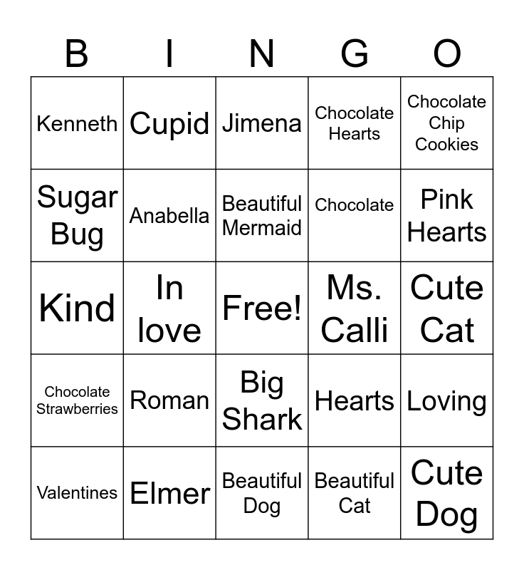 This bingo card has a free space and 29 words: Valentines, Flowers, In love, Sky, Kenneth, Jimena, Anabella, Roman, Ms. Calli, Elmer, Cute Cat, Cute Dog, Beautiful Dog, Beautiful Cat, Pink Hearts, Chocolate Marshmallows, Big Shark, Chocolate Strawberries, Chocolate Chip Cookies, Kind, Hearts, Hugs and Kisses, Chocolate, Sugar Bug, Chocolate Hearts, Cupid, Loving, Beautiful Mermaid and Heart Cookies.