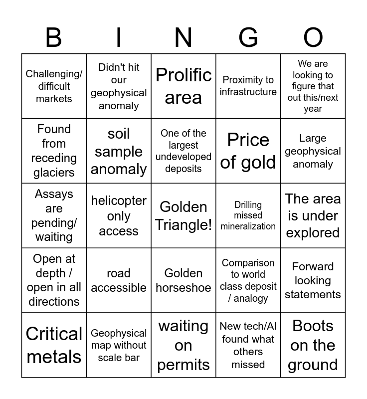 This bingo card has a free space and 24 words: road accessible, Geophysical map without scale bar, One of the largest undeveloped deposits, Critical metals, We are looking to figure that out this/next year, Challenging/ difficult markets, Found from receding glaciers, Didn't hit our geophysical anomaly, Drilling missed mineralization, Golden horseshoe, Price of gold, Assays are pending/ waiting, Comparison to world class deposit / analogy, Forward looking statements, soil sample anomaly, New tech/AI found what others missed, The area is under explored, Prolific area, Large geophysical anomaly, helicopter only access, Boots on the ground, Open at depth / open in all directions, Proximity to infrastructure and waiting on permits.