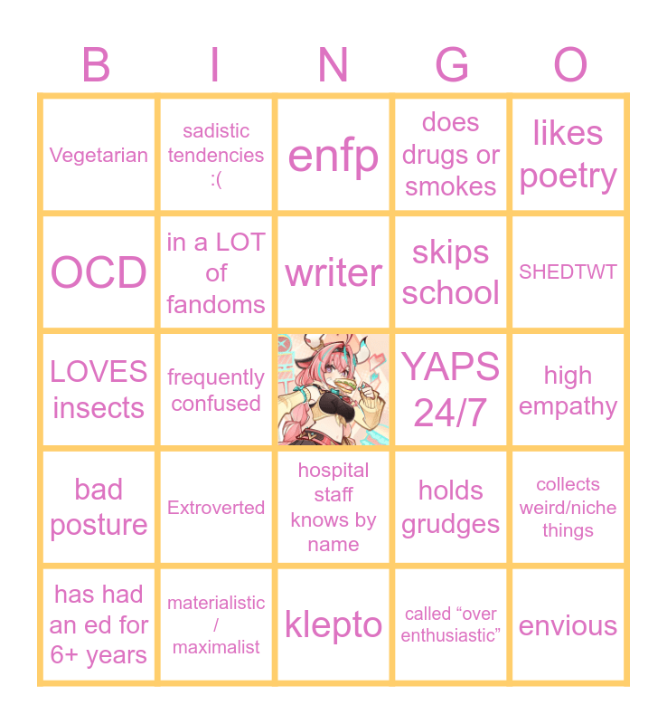 This bingo card has a free space and 24 words: Extroverted, materialistic / maximalist, writer, has had an ed for 6+ years, likes poetry, Vegetarian, OCD, sadistic tendencies :(, YAPS 24/7, hospital staff knows by name, skips school, LOVES insects, holds grudges, collects weird/niche things, in a LOT of fandoms, called “over enthusiastic”, high empathy, enfp, SHEDTWT, frequently confused, envious, bad posture, does drugs or smokes and klepto.