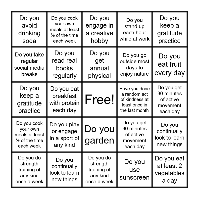This bingo card has a free space and 46 words: Do you go outside most days to enjoy nature, Do you eat at least 2 vegetables a day, Do you eat fruit every day, Do you do strength training of any kind once a week, Do you play or engage in a sport of any kind, Do you garden, Do you cook your own meals at least ½ of the time each week, Do you take at least 1 vacation each year, Do you take regular social media breaks, Do you spend quality time with friends or family once a week, Do you read real books regularly, Do you stand up each hour while at work, Do you continually look to learn new things, Do you get 30 minutes of active movement each day, Do you get 7 hours of sleep at least 5 days a week, Do you declutter your space at least once a week, Do you get annual physical, Have you done a random act of kindness at least once in the last month, Do you engage in a creative hobby, Do you keep a gratitude practice, Do you eat breakfast with protein each day, Do you use sunscreen, Do you avoid drinking soda, Do you go outside most days to enjoy nature, Do you eat at least 2 vegetables a day, Do you eat fruit every day, Do you do strength training of any kind once a week, Do you play or engage in a sport of any kind, Do you garden, Do you cook your own meals at least ½ of the time each week, Do you take at least 1 vacation each year, Do you take regular social media breaks, Do you spend quality time with friends or family once a week, Do you read real books regularly, Do you stand up each hour while at work, Do you continually look to learn new things, Do you get 30 minutes of active movement each day, Do you get 7 hours of sleep at least 5 days a week, Do you declutter your space at least once a week, Do you get annual physical, Have you done a random act of kindness at least once in the last month, Do you engage in a creative hobby, Do you keep a gratitude practice, Do you eat breakfast with protein each day, Do you use sunscreen and Do you avoid drinking soda.