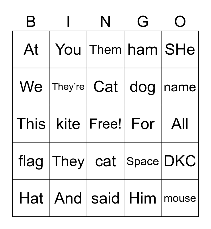 This bingo card has a free space and 24 words: Hat, They, Cat, Him, SHe, At, You, Them, For, All, This, They’re, Space, DKC, We, And, said, ham, name, flag, kite, cat, dog and mouse.