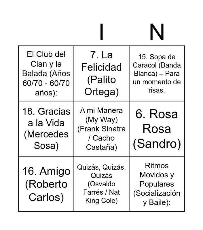 This bingo card has 23 words: La Cumparsita (Tango/Instrumental) – Escuchar en YouTube, Bésame Mucho (Lucho Gatica / Consuelo Velázquez), Quizás, Quizás, Quizás (Osvaldo Farrés / Nat King Cole), El Día que me Quieras (Carlos Gardel), A mi Manera (My Way) (Frank Sinatra / Cacho Castaña), El Club del Clan y la Balada (Años 60/70 - 60/70 años):, 6. Rosa Rosa (Sandro), 7. La Felicidad (Palito Ortega), 8. Eres Tú (Mocedades), 9. Libre (Nino Bravo), 10. Resistiré (Dúo Dinámico) – ¡Ideal para subir la energía!, Ritmos Movidos y Populares (Socialización y Baile):, 11. La Vida es un Carnaval (Celia Cruz), 12. Bailando (Alaska y los Pegamoides / Santana), 13. Zamba de mi Esperanza (Los Chalchaleros / Jorge Cafrune), 14. Abba Medley (Dancing Queen / Mamma Mia), 15. Sopa de Caracol (Banda Blanca) – Para un momento de risas., Cierre Emotivo (Lazos Sociales):, 16. Amigo (Roberto Carlos), 17. Color Esperanza (Diego Torres), 18. Gracias a la Vida (Mercedes Sosa), 19. Solo le pido a Dios (León Gieco) and 20. Brindis (Soledad Pastorutti).