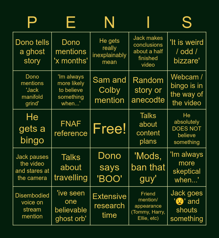 This bingo card has a free space and 24 words: Talks about travelling, 'ive seen one believable ghost orb', Sam and Colby mention, Disembodied voice on stream mention, 'It is weird / odd / bizzare', Dono tells a ghost story, Dono mentions 'Jack manifold grind', Dono mentions 'x months', Talks about content plans, Dono says 'BOO', Random story or anecodte, He gets a bingo, 'Mods, ban that guy', 'Im always more skeptical when...', 'Im always more likely to believe something when...', Friend mention/ appearance (Tommy, Harry, Ellie, etc), He absolutely DOES NOT believe something, He gets really inexplainably mean, Webcam / bingo is in the way of the video, FNAF reference, Jack goes '😧' and shouts something, Jack pauses the video and stares at the camera, Jack makes conclusions about a half finished video and Extensive research time.