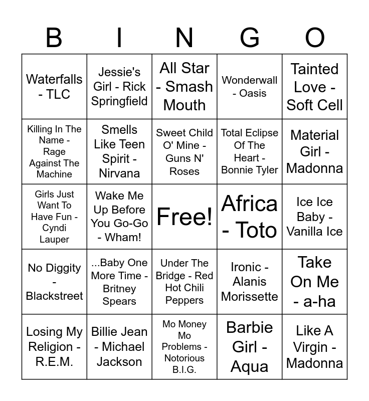 This bingo card has a free space and 40 words: Living On A Prayer - Bon Jovi, Girls Just Want To Have Fun - Cyndi Lauper, Wannabe - Spice Girls, Smells Like Teen Spirit - Nirvana, Billie Jean - Michael Jackson, Under The Bridge - Red Hot Chili Peppers, Sweet Child O' Mine - Guns N' Roses, Man! I Feel Like A Woman! - Shania Twain, Tainted Love - Soft Cell, No Diggity - Blackstreet, Wake Me Up Before You Go-Go - Wham!, Wonderwall - Oasis, Like A Virgin - Madonna, Ice Ice Baby - Vanilla Ice, Africa - Toto, ...Baby One More Time - Britney Spears, Pour Some Sugar On Me - Def Leppard, Waterfalls - TLC, Don't Stop Believin' - Journey, All Star - Smash Mouth, Take On Me - a-ha, Barbie Girl - Aqua, Total Eclipse Of The Heart - Bonnie Tyler, Killing In The Name - Rage Against The Machine, Eye Of The Tiger - Survivor, Black Or White - Michael Jackson, Karma Chameleon - Culture Club, Semi-Charmed Life - Third Eye Blind, Summer Of '69 - Bryan Adams, Everybody (Backstreet's Back) - Backstreet Boys, Should I Stay Or Should I Go - The Clash, Losing My Religion - R.E.M., Walking On Sunshine - Katrina & The Waves, Ironic - Alanis Morissette, Material Girl - Madonna, Mo Money Mo Problems - Notorious B.I.G., Call Me - Blondie, Creep - Radiohead, Jessie's Girl - Rick Springfield and Jump - Van Halen.