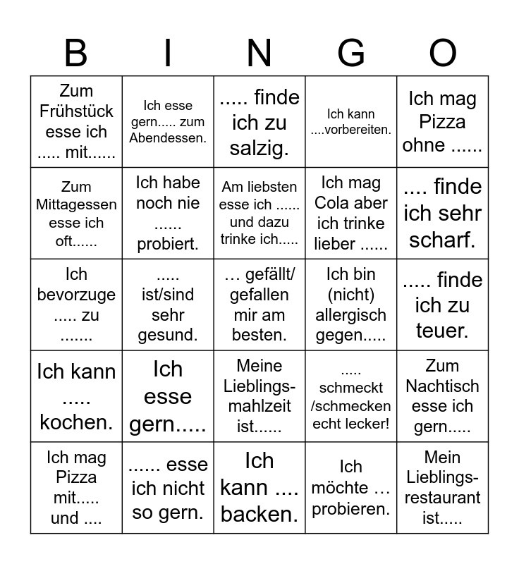 This bingo card has a free space and 24 words: Ich esse gern....., ...... esse ich nicht so gern., Am liebsten esse ich ...... und dazu trinke ich....., Ich mag Pizza mit..... und ...., Ich mag Pizza ohne ......, Zum Frühstück esse ich ..... mit......, Zum Mittagessen esse ich oft......, Ich esse gern..... zum Abendessen., Ich bin (nicht) allergisch gegen....., Meine Lieblings-mahlzeit ist......, Ich mag Cola aber ich trinke lieber ......, Ich bevorzuge ..... zu ......., ..... schmeckt /schmecken echt lecker!, Zum Nachtisch esse ich gern....., Ich habe noch nie ...... probiert., Ich möchte … probieren., ..... finde ich zu teuer., ..... finde ich zu salzig., .... finde ich sehr scharf., ..... ist/sind sehr gesund., Mein Lieblings- restaurant ist....., Ich kann ..... kochen., Ich kann ....vorbereiten. and Ich kann .... backen..
