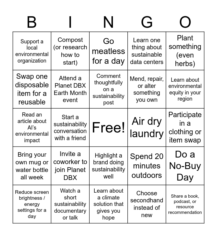 This bingo card has a free space and 28 words: Do a No-Buy Day, Complete a No-Buy Week (bonus square), Mend, repair, or alter something you own, Choose secondhand instead of new, Swap one disposable item for a reusable, Go meatless for a day, Compost (or research how to start), Bring your own mug or water bottle all week, Air dry laundry, Reduce screen brightness / energy settings for a day, Read an article about AI’s environmental impact, Learn one thing about sustainable data centers, Watch a short sustainability documentary or talk, Learn about a climate solution that gives you hope, Learn about environmental equity in your region, Share a sustainability win in Slack, Invite a coworker to join Planet DBX, Attend a Planet DBX Earth Month event, Comment thoughtfully on a sustainability post, Highlight a brand doing sustainability well, Support a local environmental organization, Donate (time or money) to a cause you care about, Share a book, podcast, or resource recommendation, Start a sustainability conversation with a friend, Participate in a clothing or item swap, Spend 20 minutes outdoors, Plant something (even herbs) and Pick up litter during a walk.