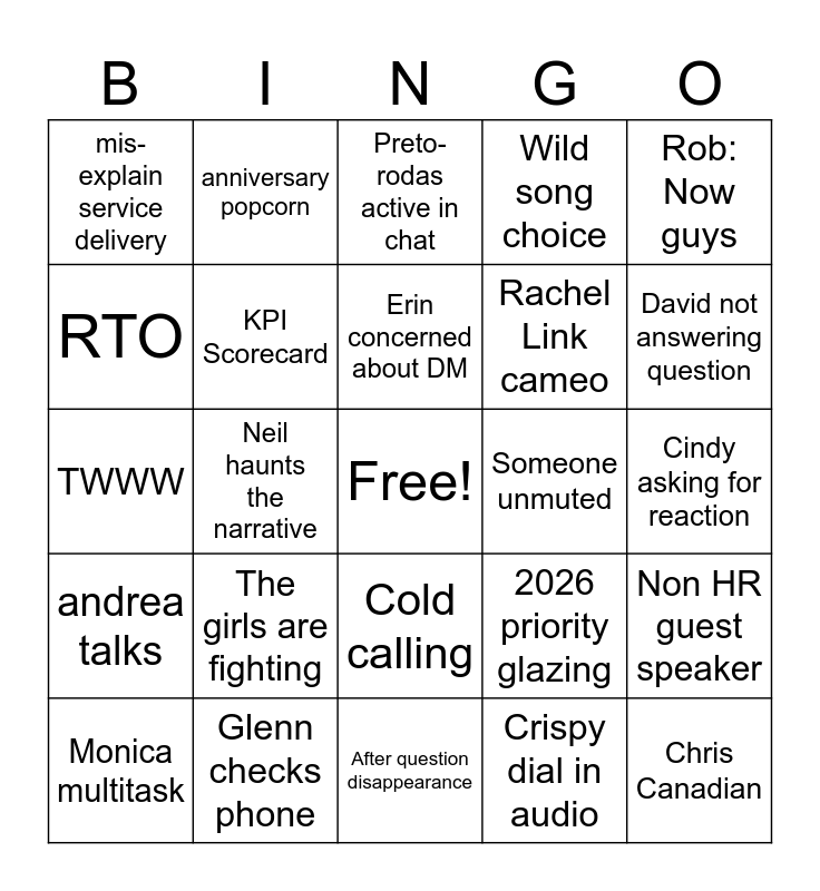 This bingo card has a free space and 24 words: The girls are fighting, Glenn checks phone, Erin concerned about DM, Monica multitask, Rob: Now guys, mis-explain service delivery, RTO, anniversary popcorn, Someone unmuted, Cold calling, Rachel Link cameo, TWWW, 2026 priority glazing, Non HR guest speaker, KPI Scorecard, Crispy dial in audio, Cindy asking for reaction, Preto-rodas active in chat, David not answering question, Neil haunts the narrative, Chris Canadian, andrea talks, Wild song choice and After question disappearance.