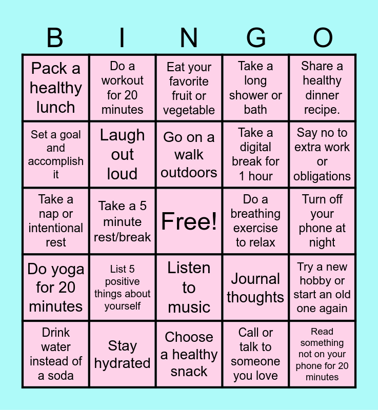 This bingo card has a free space and 24 words: List 5 positive things about yourself, Stay hydrated, Go on a walk outdoors, Drink water instead of a soda, Share a healthy dinner recipe., Pack a healthy lunch, Set a goal and accomplish it, Do a workout for 20 minutes, Do a breathing exercise to relax, Listen to music, Take a digital break for 1 hour, Take a nap or intentional rest, Journal thoughts, Try a new hobby or start an old one again, Laugh out loud, Call or talk to someone you love, Turn off your phone at night, Eat your favorite fruit or vegetable, Say no to extra work or obligations, Take a 5 minute rest/break, Read something not on your phone for 20 minutes, Do yoga for 20 minutes, Take a long shower or bath and Choose a healthy snack.