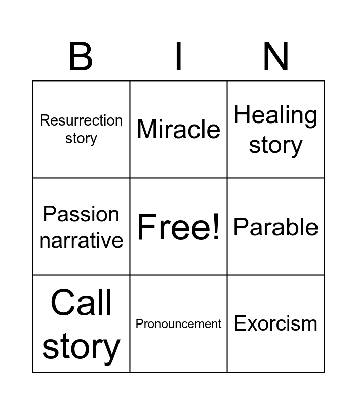 This bingo card has a free space and 8 words: Parable, Healing story, Miracle, Call story, Resurrection story, Exorcism, Passion narrative and Pronouncement.