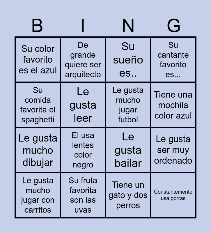 This bingo card has 16 words: Le gusta mucho jugar con carritos, Su fruta favorita son las uvas, Su sueño es.., Su cantante favorito es..., Su comida favorita el spaghetti, De grande quiere ser arquitecto, Le gusta bailar, Le gusta ser muy ordenado, Su color favorito es el azul, Le gusta leer, Tiene un gato y dos perros, Tiene una mochila color azul, Le gusta mucho dibujar, El usa lentes color negro, Le gusta mucho jugar futbol and Constantemente usa gorras.
