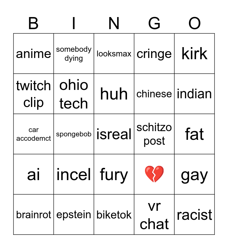 This bingo card has a free space and 24 words: incel, epstein, huh, brainrot, kirk, anime, twitch clip, somebody dying, schitzo post, fury, chinese, car accodemct, 💔, gay, ohio tech, vr chat, fat, looksmax, indian, spongebob, racist, ai, cringe and biketok.