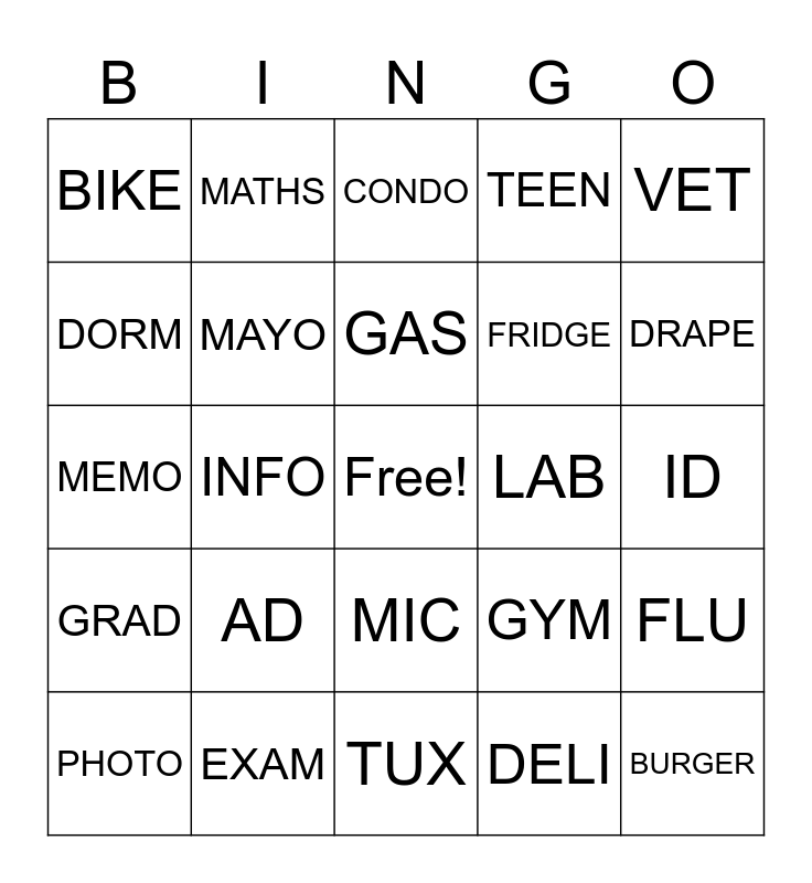 This bingo card has a free space and 24 words: AD, EXAM, GAS, PHOTO, VET, BIKE, DORM, MATHS, LAB, MIC, FRIDGE, MEMO, GYM, FLU, MAYO, DELI, ID, CONDO, DRAPE, INFO, BURGER, GRAD, TEEN and TUX.