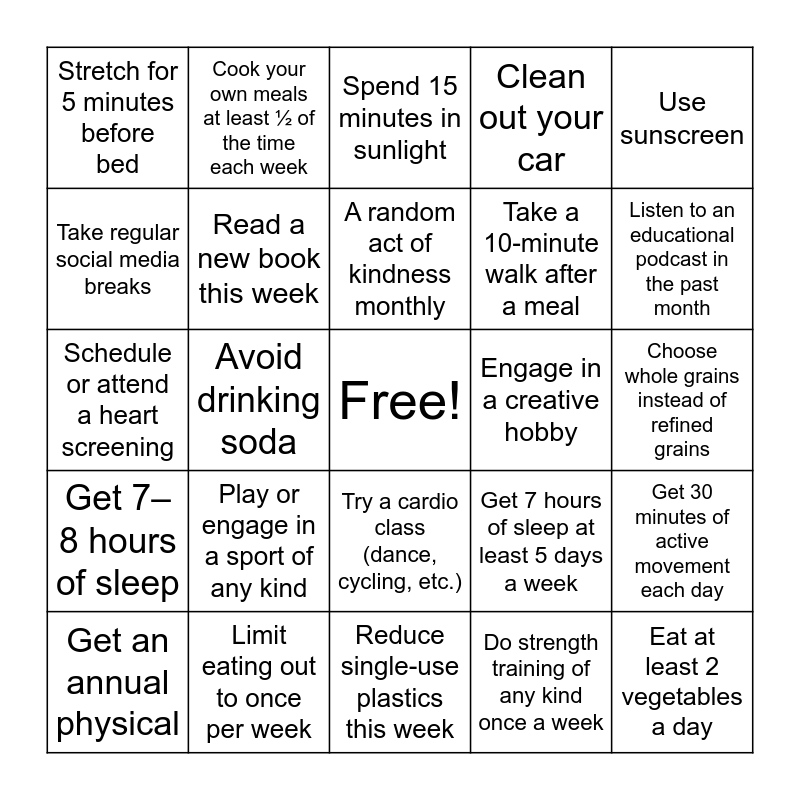 This bingo card has a free space and 53 words: Go outside most days to enjoy nature, Eat at least 2 vegetables a day, Eat fruit every day, Do strength training of any kind once a week, Play or engage in a sport of any kind, Garden, Cook your own meals at least ½ of the time each week, Take at least 1 vacation each year, Take regular social media breaks, Spend quality time with friends or family once a week, Read a new book this week, Stand up every hour while at work, Get 30 minutes of active movement each day, Get 7 hours of sleep at least 5 days a week, Declutter your space at least once a week, Get an annual physical, A random act of kindness monthly, Engage in a creative hobby, Eat breakfast with protein each day, Use sunscreen, Avoid drinking soda, Drink at least 6–8 cups of water daily, Take a 10-minute walk after a meal, Stretch for 5 minutes before bed, Try one new healthy recipe per week, Limit eating out to once per week, Pack your lunch at least 3 days a week, Practice mindful eating (no phone or TV) once a day, Do a puzzle (crossword, Sudoku, logic, etc.) once a week, Listen to an educational podcast in the past month, Journal once a week, Check in with someone you haven’t talked to in a while, Volunteer once this month, Meditate once this month, Take the stairs, Practice good posture for a day, Clean out your car, Reduce single-use plastics this week, Spend 15 minutes in sunlight, Hit an average of 8,000–10,000 steps this week, Hike a trail, Limit sodium for a week, Choose whole grains instead of refined grains, Eat leafy greens at least 4 times this week, Add beans or lentils to 3 meals, Try a cardio class (dance, cycling, etc.), Go for a bike ride, Listen to calming music, Schedule or attend a heart screening, Get 7–8 hours of sleep, No screens 30 minutes before bed, Limit alcohol for a week and Go smoke-free.