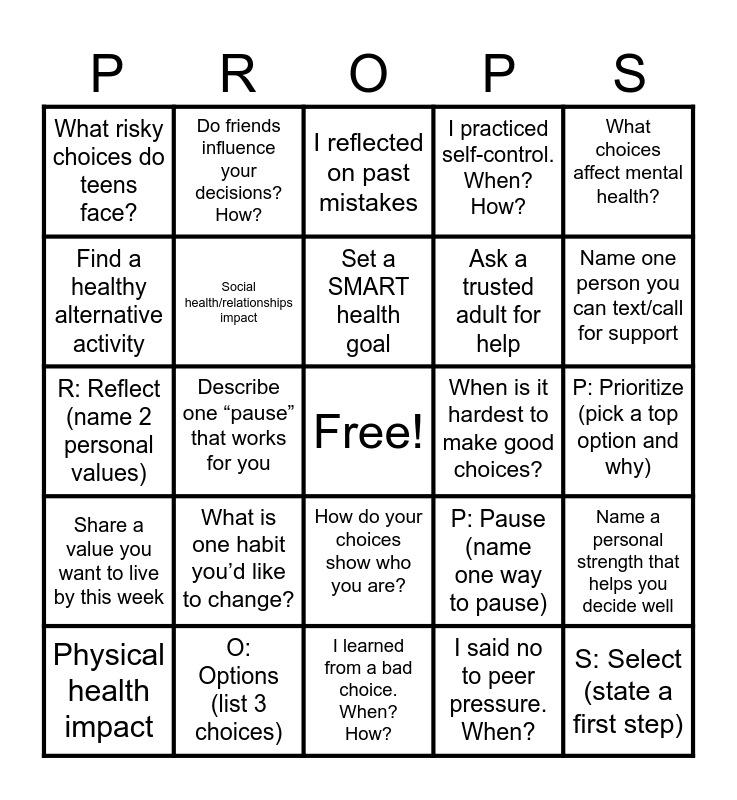 This bingo card has a free space and 27 words: P: Pause (name one way to pause), How do your choices show who you are?, Ask a trusted adult for help, I learned from a bad choice. When? How?, Find a healthy alternative activity, I reflected on past mistakes, Do friends influence your decisions? How?, Share a value you want to live by this week, When is it hardest to make good choices?, Name a personal strength that helps you decide well, R: Reflect (name 2 personal values), I practiced self-control. When? How?, Physical health impact, O: Options (list 3 choices), Name one person you can text/call for support, How does sleep, food, or stress relate to decisions?, Social health/relationships impact, Set a SMART health goal, What is one habit you’d like to change?, What risky choices do teens face?, P: Prioritize (pick a top option and why), I said no to peer pressure. When?, Describe one “pause” that works for you, S: Select (state a first step), How do your choices show who you are?, What choices affect mental health? and I chose a healthy option..