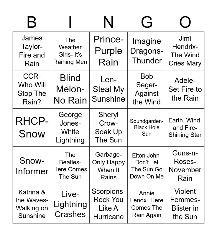 This bingo card has 28 words: Guns-n-Roses- November Rain, The Doors- Riders on the Storm, Bob Seger- Against the Wind, Annie Lenox- Here Comes The Rain Again, CCR- Who Will Stop The Rain?, Prince- Purple Rain, The Weather Girls- It’s Raining Men, Snow- Informer, Soundgarden- Black Hole Sun, Katrina & the Waves-Walking on Sunshine, RHCP- Snow, Imagine Dragons- Thunder, Live- Lightning Crashes, Scorpions- Rock You Like A Hurricane, Adele- Set Fire to the Rain, Bette Midler- The Wind Beneath My Wings, The Beatles- Here Comes The Sun, Blind Melon- No Rain, Len- Steal My Sunshine, Garbage- Only Happy When It Rains, James Taylor- Fire and Rain, Violent Femmes- Blister in the Sun, Sheryl Crow- Soak Up The Sun, George Jones- White Lightning, Earth, Wind, and Fire- Shining Star, Elton John- Don’t Let The Sun Go Down On Me, Jimi Hendrix- The Wind Cries Mary and Bob Dylan- Hurricane.