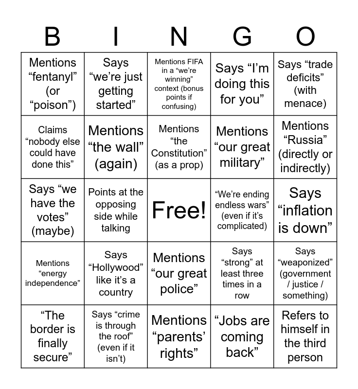 This bingo card has a free space and 123 words: Says “tremendous”, Says “believe me”, Says “many people are saying”, Says “nobody has ever seen anything like it”, Calls something “the best in history”, Uses “very, very” for emphasis, Says “we’re just getting started”, Mentions “common sense”, Says “strong” at least three times in a row, Refers to himself in the third person, Mentions “ratings” or TV viewership, Mentions crowd size (directly or indirectly), “Fake news” / “dishonest media”, “Witch hunt”, “Rigged” (anything), “Radical” (someone or something), “Disaster” (someone else’s policy), “Beautiful” (bill, plan, deal, something weirdly not beautiful), “Perfect” (phone call, plan, policy, etc.), “Total catastrophe” (about something that is not literally a catastrophe), “The border is finally secure”, Mentions “the wall” (again), Says “invasion”, Says “cartels”, Mentions “human trafficking”, Mentions “fentanyl” (or “poison”), Mentions “sanctuary cities”, Says “law and order”, Mentions “violent criminals” being removed, “We’re deporting them fast”, Mentions “narco-terrorists” (your square, obviously), Says “crime is through the roof” (even if it isn’t), Says “bad hombres” energy without saying “bad hombres”, Mentions “gangs” by name or vibe, Promises “the biggest crackdown ever”, Says “we’re not playing games anymore”, Says “zero tolerance” (or basically that), Claims “the economy is roaring”, “Jobs are coming back”, “Manufacturing is coming back”, Mentions “energy independence”, “Drill, baby, drill” (or equivalent), Mentions “gas prices” as a trophy, Mentions “interest rates” like he personally sets them, Says “inflation is down”, Says “we’re cutting regulations”, Calls something a “job-killing regulation”, Mentions “China” as a foil, Mentions “tariffs” as a flex, Says “trade deficits” (with menace), Mentions “supply chains”, “We’re bringing companies back home”, Mentions “farmers” as a core constituency, Says “we’re making America rich again”, Mentions “the greatest economy in history” (again), Says “we’re respected again”, Mentions “peace through strength”, Mentions “NATO” in a threatening tone, Mentions “Ukraine” (support, leverage, deal, or criticism), Mentions “Russia” (directly or indirectly), Mentions “Iran” (threat, deal, or sanctions), Mentions “Israel” (support language), Mentions “China” + “strength” in the same sentence, Says “I spoke with [leader]” without details, Claims “we’re close to a historic deal”, Claims “nobody else could have done this”, Mentions a “hostage” situation (real or rhetorical), Mentions “the Middle East” as one blob, “We’re ending endless wars” (even if it’s complicated), Says “weaponized” (government / justice / something), Mentions “deep state”, Mentions “election integrity”, Mentions “the Constitution” (as a prop), Mentions “free speech”, Mentions “woke” (or “wokeness”), Mentions “DEI”, Mentions “critical race theory” (even if not relevant), Mentions “parents’ rights”, Mentions “gender ideology”, Mentions “pronouns” sarcastically, Mentions “lawfare”, Mentions “corruption” (generalized), Says “they” (mysterious villains) are coming after you/me/us, Says “I’m doing this for you”, “Thank you” to the Speaker, then immediately dunks, Calls out “some people in this room”, Points at the opposing side while talking, Gets loud applause, then pauses for it like a sitcom laugh track, One-liner clearly designed to become a viral clip, Says “it’s true” right after saying something unverifiable, Says “I could stand here all night”, Shouts out “hardworking Americans”, Mentions “our great police”, Mentions “our great military”, Mentions “our beautiful flag”, Mentions “God bless America”, Brings up a guest in the gallery for emotional impact, Calls something “bipartisan” while everyone looks uncomfortable, Says “we’re united” immediately after a divisive line, Promises a bill that will be “passed very quickly”, Says “we have the votes” (maybe), Mentions Nobel Peace Prize (even as a joke, rumor, or grievance), Mentions FIFA in a “we’re winning” context (bonus points if confusing), Mentions “the most beautiful” building/project he’s associated with, Mentions “my friends” who are “very successful”, Mentions “the greatest deal-maker”, Mentions “my administration has done more than any administration”, Mentions “historic” at least 4 times, Mentions “record-setting” anything, Mentions “I was right” (explicitly), Mentions “everyone’s talking about it”, Claims he predicted something years ago, Mentions “Billions and billions” (or equivalent), Mentions a “brand new” initiative with a catchy name, Mentions a commission/task force with an intense title, Praises Melania Trump in a “classy/elegant” mini-tribute, Promotes “my wife’s movie” (your square, iconic), Shouts out JD Vance with awkward buddy energy, Mentions “great people” in his cabinet “working 24/7”, Mentions a billionaire ally without naming them (but everyone knows), Mentions a tech CEO in a “they agree with me” way, Says “Hollywood” like it’s a country and Mentions “social media” like it’s a battlefield.