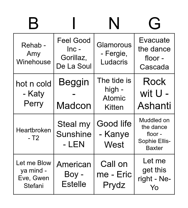 This bingo card has 16 words: American Boy - Estelle, Muddled on the dance floor - Sophie Ellis-Baxter, Glamorous - Fergie, Ludacris, Rehab - Amy Winehouse, Heartbroken - T2, Feel Good Inc - Gorillaz, De La Soul, Good life - Kanye West, Call on me - Eric Prydz, hot n cold - Katy Perry, Beggin - Madcon, Let me Blow ya mind - Eve, Gwen Stefani, Evacuate the dance floor - Cascada, Steal my Sunshine - LEN, Rock wit U - Ashanti, The tide is high - Atomic Kitten and Let me get this right - Ne-Yo.