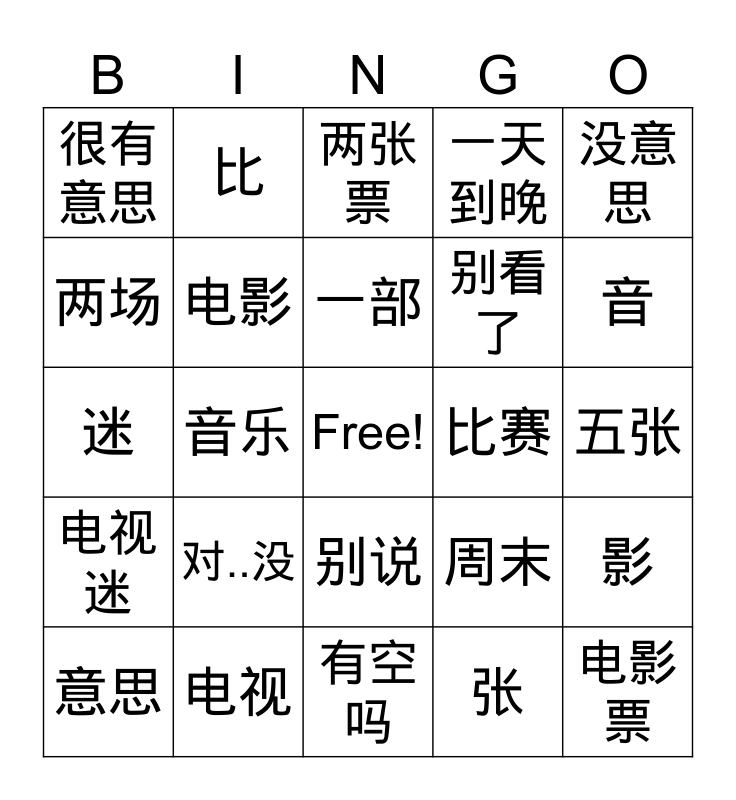 This bingo card has a free space and 24 words: 对..没, 电视, 一部, 意思, 没意思, 很有意思, 两场, 比, 比赛, 别说, 别看了, 迷, 周末, 影, 电影, 张, 五张, 两张票, 音, 音乐, 电影票, 电视迷, 一天到晚 and 有空吗.