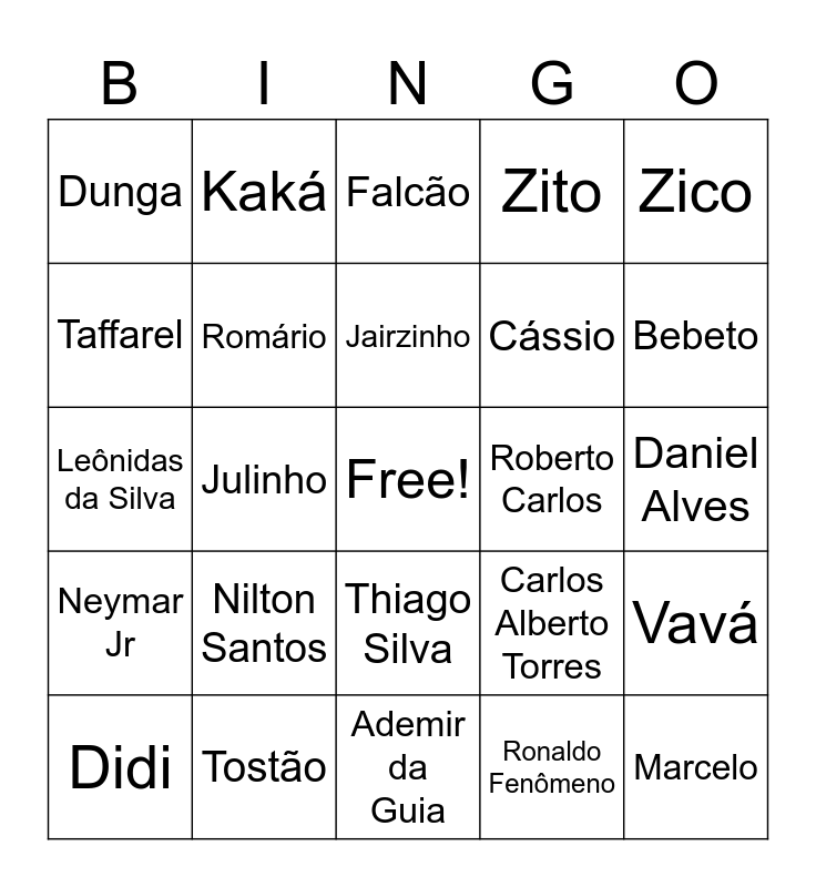 This bingo card has a free space and 34 words: Ronaldinho Gaúcho, Ronaldo Fenômeno, Garrincha, Pelé, Neymar Jr, Romário, Zico, Didi, Kaká, Rivaldo, Jairzinho, Falcão, Sócrates, Rivellino, Roberto Carlos, Bebeto, Tostão, Leônidas da Silva, Nilton Santos, Carlos Alberto Torres, Thiago Silva, Casemiro, Dunga, Daniel Alves, Ademir da Guia, Marcelo, Zito, Marcelinho Carioca, Cássio, Taffarel, Djalma Santos, Julinho, Vavá and Leandro.