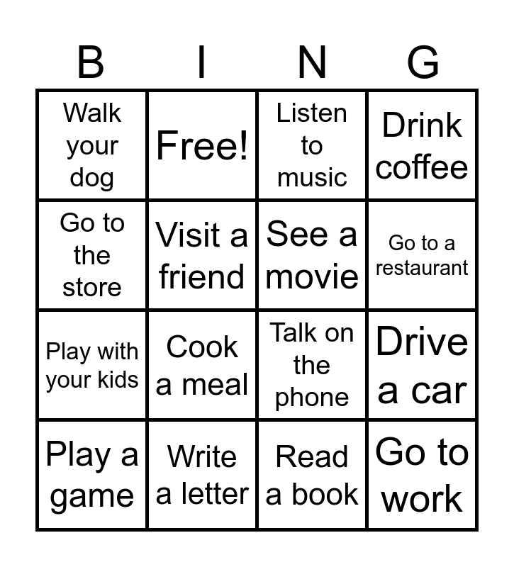 This bingo card has 19 words: Talk on the phone, Watch TV, Listen to music, Go to work, Drive a car, Go to the store, Read a book, Walk your dog, Free!, Play with your kids, Cook a meal, Visit a friend, See a movie, Write a letter, Play a game, Practice English, Drink coffee, Go to a restaurant and Clean your house.