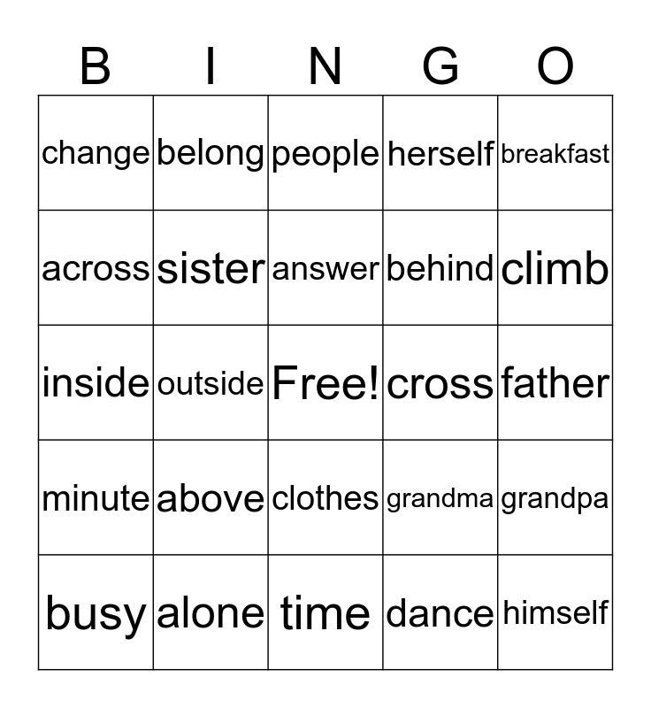 This bingo card has a free space and 24 words: above, alone, answer, busy, breakfast, change, across, belong, cross, clothes, behind, inside, grandma, grandpa, sister, dance, father, people, climb, outside, himself, minute, herself and time.