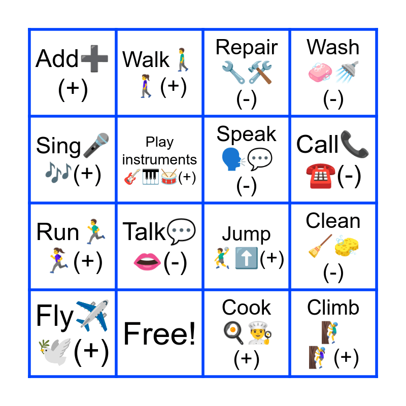 This bingo card has 21 words: Free!, Tell stories📖🗣️ (-), Walk🚶♂️🚶♀️(+), Send📤✉️ (-), Cook🍳👨🍳(+), Speak🗣️💬(-), Add➕ (+), Repair🔧🛠️ (-), Jump🤾♂️⬆️(+), Call📞☎️(-), Run🏃♂️🏃♀️(+), Wash🧼🚿(-), Climb🧗♂️🧗♀️(+), Play sports⚽🏀🏈(-), Play instruments🎸🎹🥁(+), Dance💃🕺(-), Fly✈️🕊️(+), Talk💬👄(-), Sing🎤🎶(+), Clean🧹🧽(-) and Carry🎒📦(+).