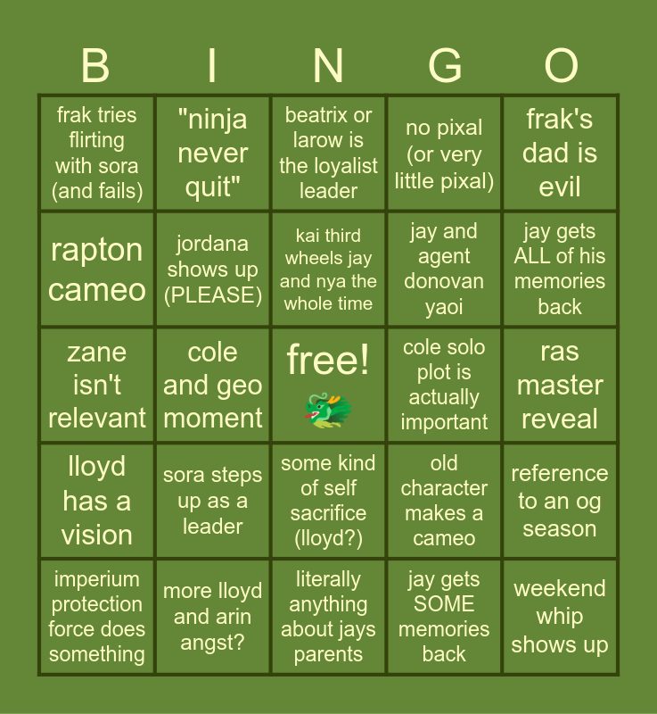 This bingo card has a free space and 24 words: sora steps up as a leader, more lloyd and arin angst?, kai third wheels jay and nya the whole time, imperium protection force does something, frak's dad is evil, frak tries flirting with sora (and fails), rapton cameo, "ninja never quit", cole solo plot is actually important, some kind of self sacrifice (lloyd?), jay and agent donovan yaoi, zane isn't relevant, old character makes a cameo, reference to an og season, jordana shows up (PLEASE), jay gets SOME memories back, ras master reveal, beatrix or larow is the loyalist leader, jay gets ALL of his memories back, cole and geo moment, weekend whip shows up, lloyd has a vision, no pixal (or very little pixal) and literally anything about jays parents.