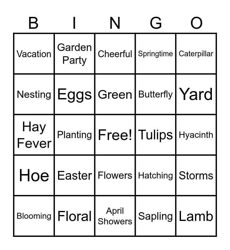 This bingo card has a free space and 92 words: Allergies, April, April Showers, Arrival, Balmy, Baseball, Bloom, Blooming, Blossoms, Bouquet, Breeze, Budding, Bunny, Butterfly, Calf, Caterpillar, Cheerful, Cherry Blossoms, Crocuses, Crops, Daffodil, Daisies, Daylight Saving, Earth Day, Easter, Eggs, Emerge, Equinox, Fertilizer, Festivals, Floral, Flowers, Foal, Garden, Garden Party, Germinate, Good Friday, Grass, Green, Hatching, Hay Fever, Hoe, Hyacinth, June, Lamb, Lambs, Lawn Mowing, March, Mardi Gras, Marigolds, May, May Day, Maypole, Memorial Day, Migrate, Mulch, Nature, Nesting, Orchid, Planting, Pruning, Rain, Rainbow, Rebirth, Roses, Sapling, Season, Seeds, Shovel, Showers, Spring Break, Spring Cleaning, Springtime, Sprinkle, Sprout, St. Patrick’s Day, Storms, Sun, Sundress, Tadpoles, Taxes, Tulips, Vacation, Vernal Equinox, Warming, Warmth, Wedding, Weeds, Wheelbarrow, Windy, Yard and Zinnias.