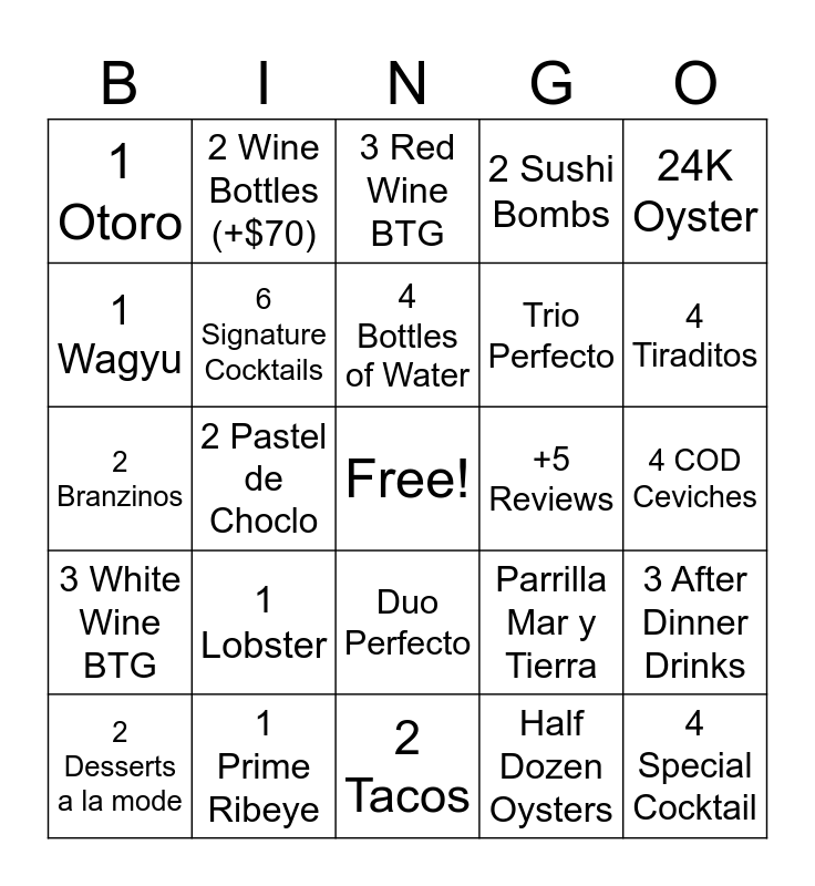 This bingo card has a free space and 24 words: 1 Lobster, 1 Prime Ribeye, 4 Bottles of Water, 2 Desserts a la mode, 24K Oyster, 1 Otoro, 1 Wagyu, 2 Wine Bottles (+$70), +5 Reviews, Duo Perfecto, Trio Perfecto, 2 Branzinos, Parrilla Mar y Tierra, 3 After Dinner Drinks, 6 Signature Cocktails, Half Dozen Oysters, 4 COD Ceviches, 3 Red Wine BTG, 4 Tiraditos, 2 Pastel de Choclo, 4 Special Cocktail, 3 White Wine BTG, 2 Sushi Bombs and 2 Tacos.