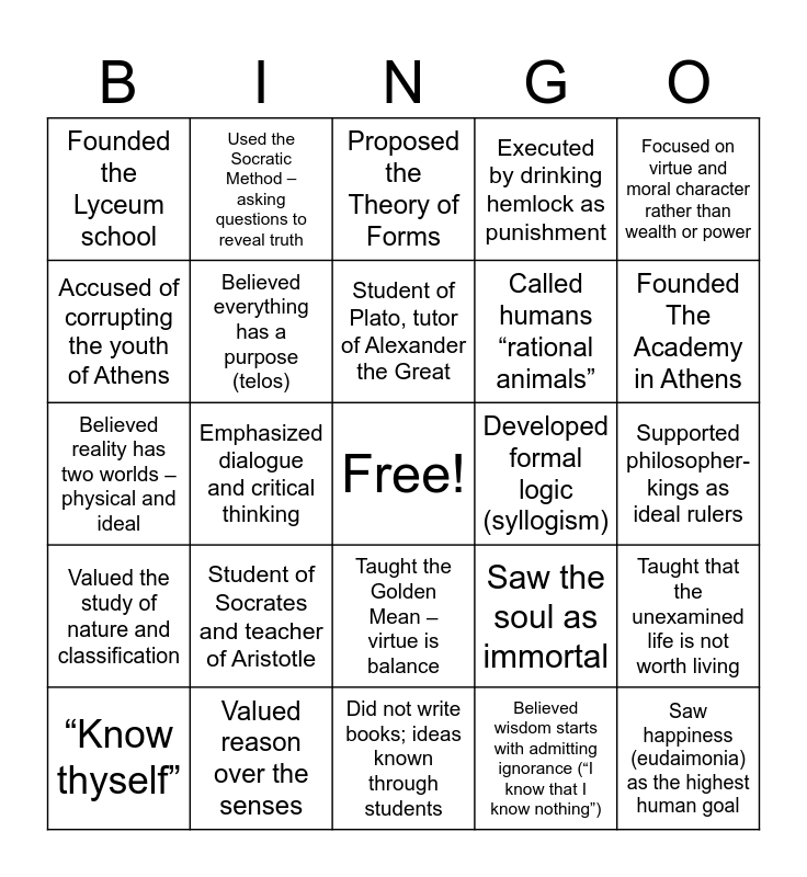 This bingo card has a free space and 25 words: “Know thyself”, Student of Socrates and teacher of Aristotle, Student of Plato, tutor of Alexander the Great, Believed wisdom starts with admitting ignorance (“I know that I know nothing”), Founded The Academy in Athens, Founded the Lyceum school, Used the Socratic Method – asking questions to reveal truth, Proposed the Theory of Forms, Called humans “rational animals”, Taught that the unexamined life is not worth living, Believed reality has two worlds – physical and ideal, Believed everything has a purpose (telos), Saw the soul as immortal, Saw happiness (eudaimonia) as the highest human goal, Accused of corrupting the youth of Athens, Valued reason over the senses, Did not write books; ideas known through students, Executed by drinking hemlock as punishment, Supported philosopher-kings as ideal rulers, Valued the study of nature and classification, Emphasized dialogue and critical thinking, Taught the Golden Mean – virtue is balance, Developed formal logic (syllogism), Focused on virtue and moral character rather than wealth or power and Introduced the Allegory of the Cave.