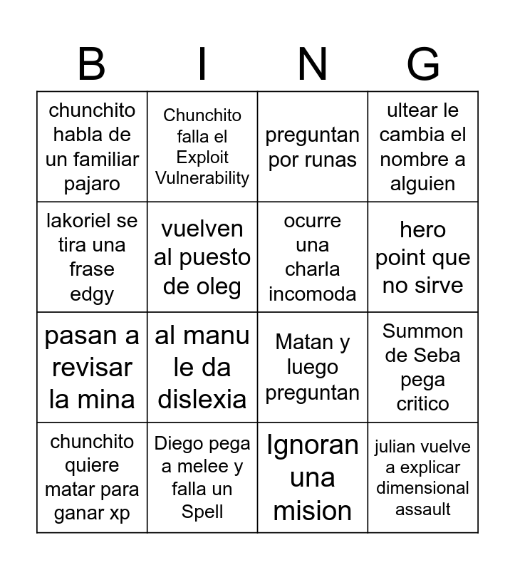 This bingo card has 16 words: Diego pega a melee y falla un Spell, Summon de Seba pega critico, preguntan por runas, chunchito habla de un familiar pajaro, pasan a revisar la mina, Chunchito falla el Exploit Vulnerability, Matan y luego preguntan, Ignoran una mision, lakoriel se tira una frase edgy, vuelven al puesto de oleg, chunchito quiere matar para ganar xp, ultear le cambia el nombre a alguien, al manu le da dislexia, hero point que no sirve, ocurre una charla incomoda and julian vuelve a explicar dimensional assault.