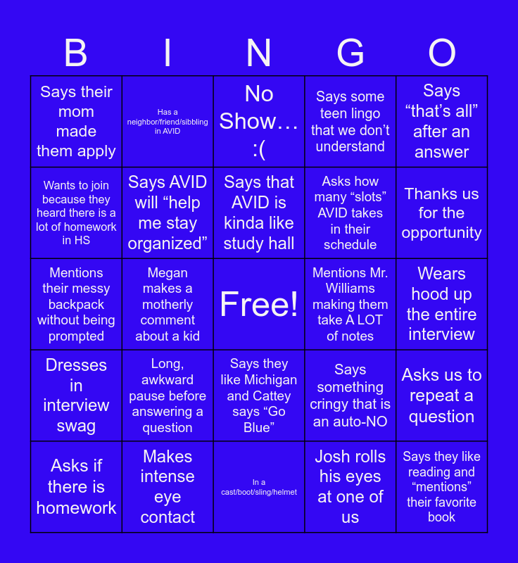 This bingo card has a free space and 24 words: Long, awkward pause before answering a question, Makes intense eye contact, Says that AVID is kinda like study hall, Asks if there is homework, Says “that’s all” after an answer, Says their mom made them apply, Wants to join because they heard there is a lot of homework in HS, Has a neighbor/friend/sibbling in AVID, Mentions Mr. Williams making them take A LOT of notes, Says they like Michigan and Cattey says “Go Blue”, Asks how many “slots” AVID takes in their schedule, Mentions their messy backpack without being prompted, Says something cringy that is an auto-NO, Asks us to repeat a question, Says AVID will “help me stay organized”, Josh rolls his eyes at one of us, Wears hood up the entire interview, No Show… :(, Thanks us for the opportunity, Megan makes a motherly comment about a kid, Says they like reading and “mentions” their favorite book, Dresses in interview swag, Says some teen lingo that we don’t understand and In a cast/boot/sling/helmet.