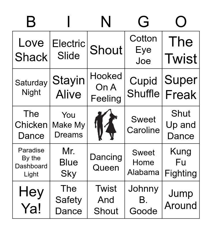 This bingo card has a free space and 54 words: Celebration, Paradise By the Dashboard Light, Come On Eileen, Wobble, Dancing Queen, Macarena, Cotton Eye Joe, Barbie Girl, Saturday Night, You Shook Me All Night Long, Love Shack, Girls Just Want to Have Fun, The Safety Dance, Hey Ya!, Footloose, Twist And Shout, Jump Around, Cupid Shuffle, Happy, Shut Up and Dance, Sweet Home Alabama, Wake Me Up Before You Go-Go, Sweet Caroline, The Twist, Party In The U.S.A., Electric Slide, Y.M.C.A., Bye Bye Bye, U Can't Touch This, Johnny B. Goode, Play That Funky Music, The Loco-Motion, Ice Ice Baby, Cha Cha Slide, Shout, Shake It Off, The Chicken Dance, Kung Fu Fighting, Save a Horse, Stayin Alive, Don't Stop Believin', Old Time Rock & Roll, You're The One That I Want, Yeah!, Mr. Blue Sky, Uptown Funk, Fishing In The Dark, September, Hooked On A Feeling, You Make My Dreams, Super Freak, I Love Rock 'N Roll, Livin' On A Prayer and I Wanna Dance with Somebody.