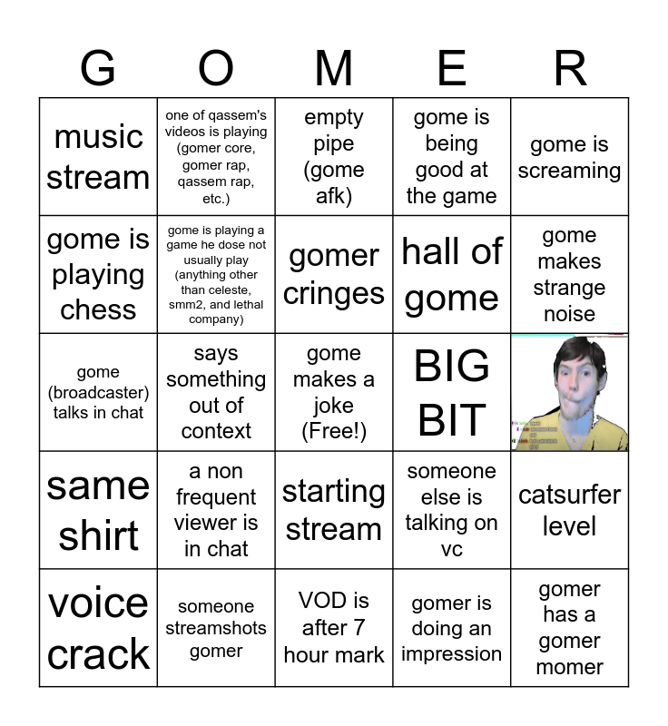 This bingo card has 3 images, a free space and 49 words: gomer touches his hair, gomer has a gomer momer, random gomer noise is playing, VOD is after 7 hour mark, a non frequent viewer is in chat, something non family friendly happens on stream, one of qassem's videos is playing (gomer core, gomer rap, qassem rap, etc.), bromer took over gomer's stream, gome is playing chess, technical error (mic muted, game audio muted, camera off, etc.), gome is playing a game he dose not usually play (anything other than celeste, smm2, and lethal company), gome is being good at the game, catsurfer level, someone else is talking on vc, herman gives gome gaming advice, pipe cloud set-up (the set-up where there is no game on screen), gomer cringes, BIG BIT, gome ignores a message in chat, gome is screaming, says something out of context, gomer is doing an impression, music stream, hall of gome, visible green screen, qassem's name is said wrong, gome makes strange noise, gome is snacking, empty pipe (gome afk), starting stream, gomer laughs at gome_bot message, someone subs, (when you say real), (when you say fake), someone streamshots gomer, gomer is doing a live reaction, gome working out, gome is echoing, repeat of called space, you laugh at the VOD, old era gome, dorrieal on stream, gomer is playing Alex_GPTV VOD Bingo, voice crack, gome (broadcaster) talks in chat, gome is silent for a long time, carechive and me name mix up, same shirt and same VOD gotten twice.