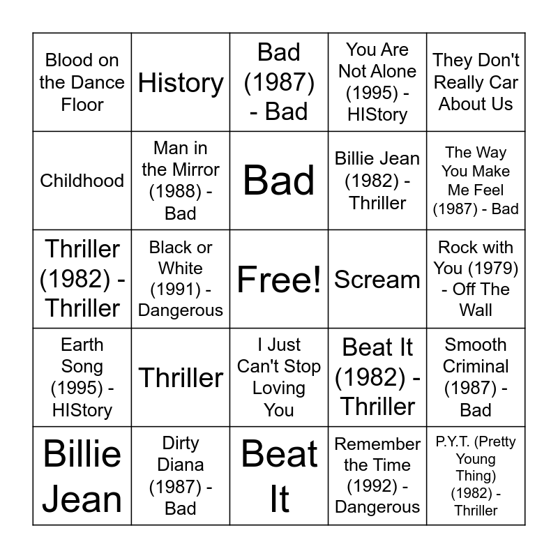 This bingo card has a free space and 25 words: Thriller, Beat It, Bad, Billie Jean, They Don't Really Car About Us, Blood on the Dance Floor, Childhood, History, Scream, I Just Can't Stop Loving You, Billie Jean (1982) - Thriller, Thriller (1982) - Thriller, Beat It (1982) - Thriller, Smooth Criminal (1987) - Bad, Man in the Mirror (1988) - Bad, Don't Stop 'Til You Get Enough (1979) - Off The Wall, Rock with You (1979) - Off The Wall, Bad (1987) - Bad, The Way You Make Me Feel (1987) - Bad, Black or White (1991) - Dangerous, P.Y.T. (Pretty Young Thing) (1982) - Thriller, Dirty Diana (1987) - Bad, Earth Song (1995) - HIStory, You Are Not Alone (1995) - HIStory and Remember the Time (1992) - Dangerous.