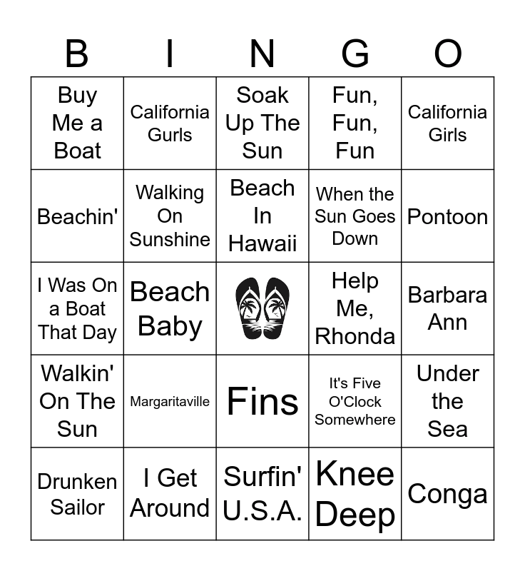 This bingo card has a free space and 52 words: Yo Ho, Conga, Red Solo Cup, Surfin' U.S.A., Margaritaville, Toes, California Gurls, Good Vibrations, Beachin', Jump in the Line, Walking On Sunshine, Don't Worry, Be Happy, Under the Sea, It's Five O'Clock Somewhere, Island Song, Cheeseburger In Paradise, Beach In Hawaii, Help Me, Rhonda, Beach Cruiser, California Girls, Beach Baby, Knee Deep, Buy Me a Boat, When the Sun Goes Down, Rock Lobster, Kokomo, Vacation, Beach Party, Pontoon, Luau Cha Cha Cha, Changes In Latitudes, Changes In Attitudes, Fun, Fun, Fun, All Summer Long, In the Summertime, Boat Drinks, Soak Up The Sun, I Get Around, The Tide Is High, Some Beach, Bang the Drum All Day, Come Sail Away, Barbara Ann, Walkin' On The Sun, Vacation, Fins, Volcano, Island In The Sun, I Was On a Boat That Day, Cruise, Catch A Wave, Drunken Sailor and Love Shack.