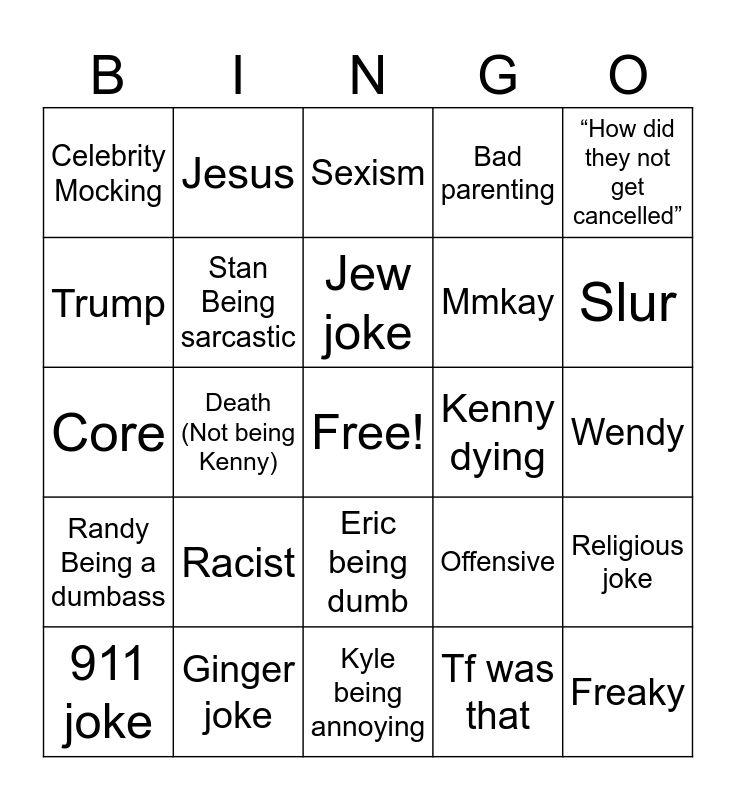 This bingo card has a free space and 24 words: Racist, Ginger joke, Jew joke, 911 joke, “How did they not get cancelled”, Celebrity Mocking, Trump, Jesus, Kenny dying, Eric being dumb, Mmkay, Core, Offensive, Religious joke, Stan Being sarcastic, Tf was that, Wendy, Sexism, Slur, Death (Not being Kenny), Freaky, Randy Being a dumbass, Bad parenting and Kyle being annoying.