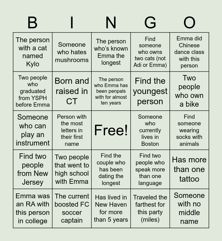 This bingo card has a free space and 24 words: Two people that went to high school with Emma, The current boosted FC soccer captain, The person who Emma has been penpals with for almost ten years, Emma was an RA with this person in college, Emma did Chinese dance class with this person, The person with a cat named Kylo, Two people who graduated from YSPH before Emma, Someone who hates mushrooms, Someone who currently lives in Boston, Find the couple who has been dating the longest, Find the youngest person, Someone who can play an instrument, Find two people who speak more than one language, Has more than one tattoo, Born and raised in CT, Traveled the farthest for this party (miles), Find someone wearing socks with animals, The person who’s known Emma the longest, Two people who own a bike, Person with the most letters in their first name, Someone with no middle name, Find two people from New Jersey, Find someone who owns two cats (not Adi or Emma) and Has lived in New Haven for more than 5 years.