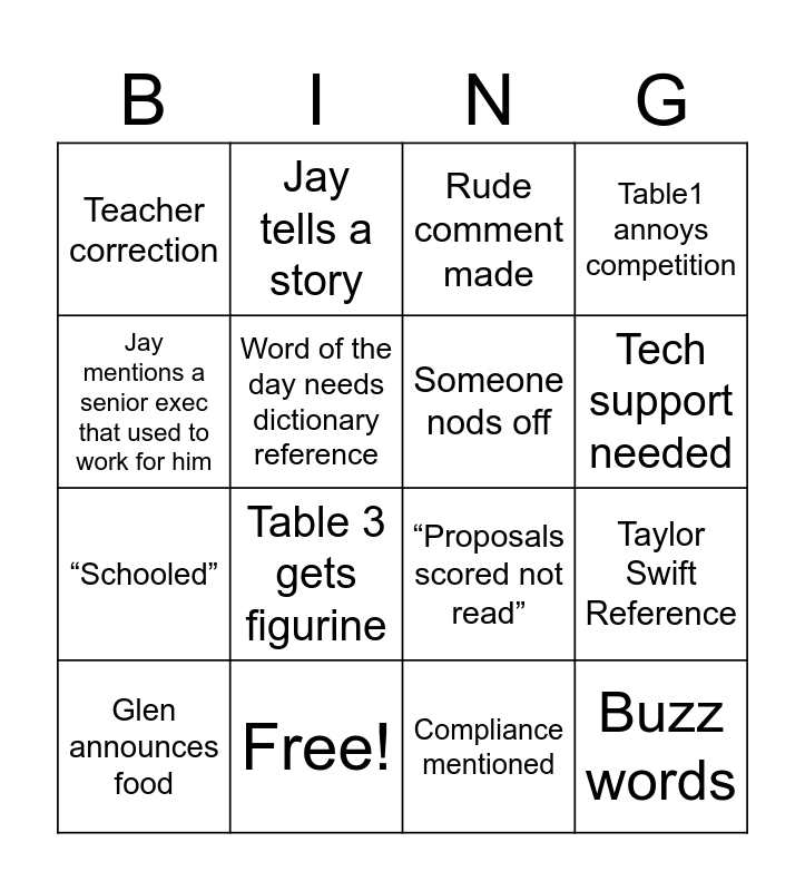 This bingo card has 16 words: Free!, Taylor Swift Reference, Rude comment made, Teacher correction, “Schooled”, Jay tells a story, “Proposals scored not read”, Compliance mentioned, Jay mentions a senior exec that used to work for him, Word of the day needs dictionary reference, Glen announces food, Table1 annoys competition, Table 3 gets figurine, Tech support needed, Someone nods off and Buzz words.
