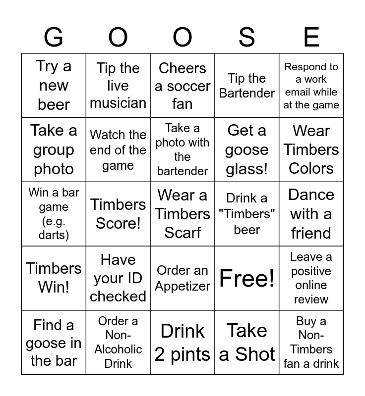 This bingo card has 25 words: Have your ID checked, Drink 2 pints, Take a photo with the bartender, Find a goose in the bar, Respond to a work email while at the game, Try a new beer, Take a group photo, Tip the live musician, Drink a "Timbers" beer, Order an Appetizer, Get a goose glass!, Win a bar game (e.g. darts), Free!, Leave a positive online review, Watch the end of the game, Buy a Non-Timbers fan a drink, Dance with a friend, Cheers a soccer fan, Wear Timbers Colors, Timbers Score!, Wear a Timbers Scarf, Order a Non-Alcoholic Drink, Timbers Win!, Tip the Bartender and Take a Shot.