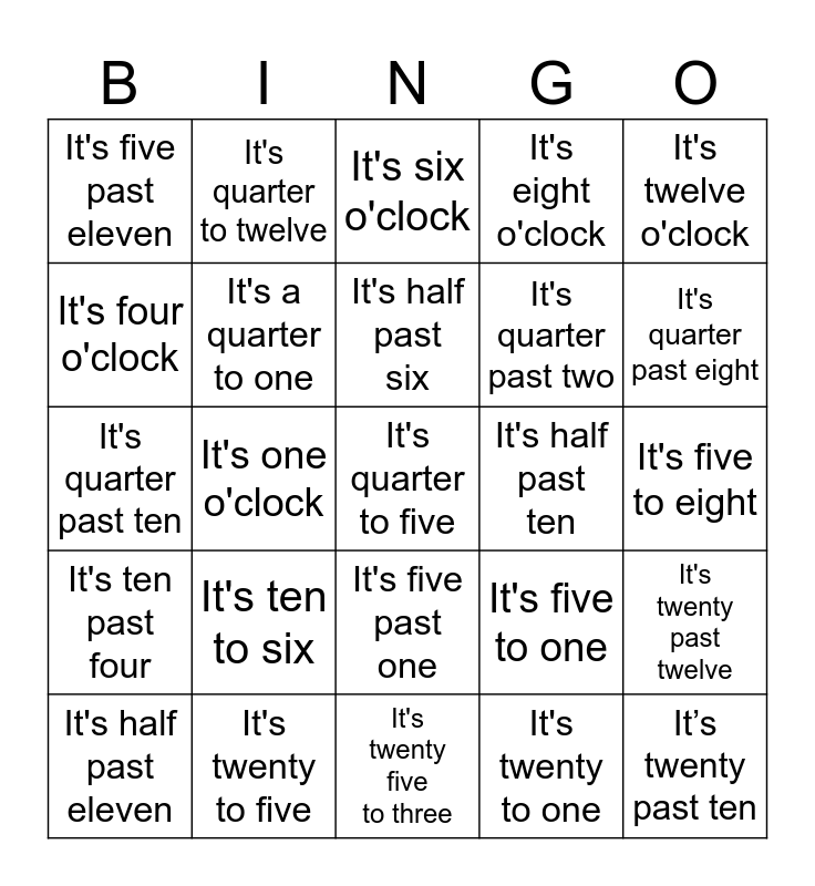 This bingo card has a free space and 24 words: It's half past eleven, It's ten to six, It's half past six, It's twenty to one, It's twelve o'clock, It's five past eleven, It's quarter to twelve, It's six o'clock, It's half past ten, It's five to eight, It's quarter past ten, It's a quarter to one, It's five to one, It's twenty past twelve, It's four o'clock, It's twenty to five, It's twenty five to three, It's eight o'clock, It's quarter past eight, It's ten past four, It's one o'clock, It's five past one, It's quarter past two and It’s twenty past ten.