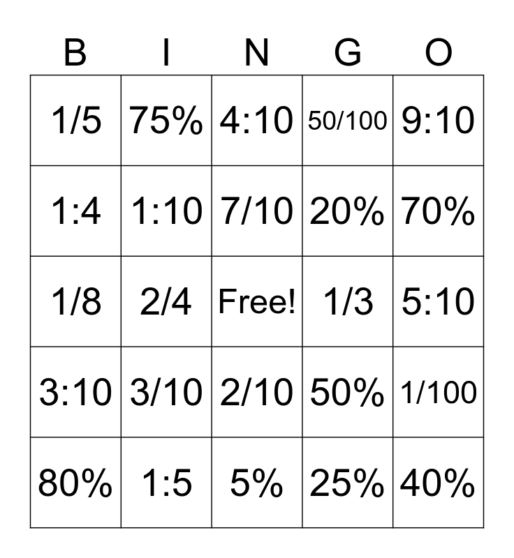 This bingo card has a free space and 24 words: 3/10, 1:5, 7/10, 80%, 9:10, 1/5, 1:4, 75%, 1/3, 2/10, 20%, 1/8, 50%, 1/100, 1:10, 25%, 5:10, 4:10, 70%, 2/4, 40%, 3:10, 50/100 and 5%.
