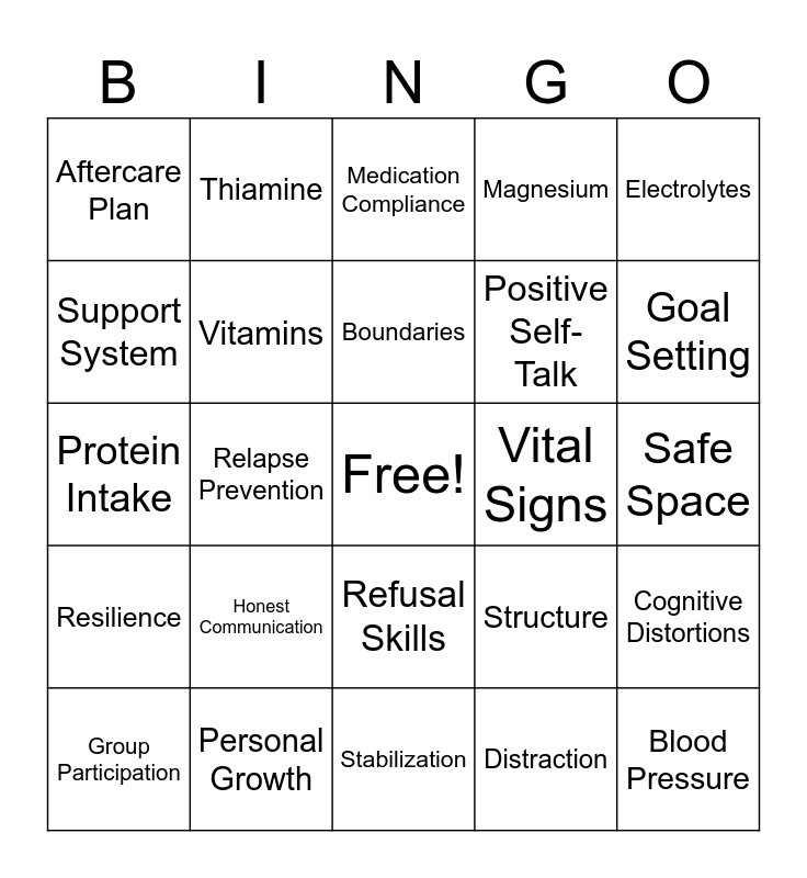 This bingo card has a free space and 75 words: Hydration, Sleep Hygiene, Medication Compliance, Anxiety Management, Depression Awareness, Coping Skills, Grounding, Deep Breathing, HALT, Stress Management, Mood Check, Triggers, Boundaries, Support System, Self-Care, Relapse Prevention, Withdrawal Symptoms, Blood Pressure, Heart Rate, Electrolytes, Balanced Meals, Protein Intake, Vitamins, Thiamine, Magnesium, Folic Acid, Multivitamin, Journaling, Mindfulness, Meditation, Walk Outside, Light Exercise, Routine, Structure, Goal Setting, Positive Self-Talk, Emotional Regulation, Anger Management, Safe Space, Distraction, Urge Surfing, Delay Technique, Call Support, Peer Support, Therapy Session, Case Manager, Group Participation, Aftercare Plan, Crisis Plan, Warning Signs, High-Risk Situations, Refusal Skills, Sleep Routine, No Caffeine, Relaxation, Progressive Muscle Relaxation, White Noise, Dark Room, Healthy Boundaries, Accountability, Honest Communication, Gratitude, Sober Network, Medication Education, Side Effects, Vital Signs, Self-Awareness, Impulse Control, Thought Challenging, Cognitive Distortions, Resilience, Personal Growth, Community Resources, Stabilization and Safety Plan.