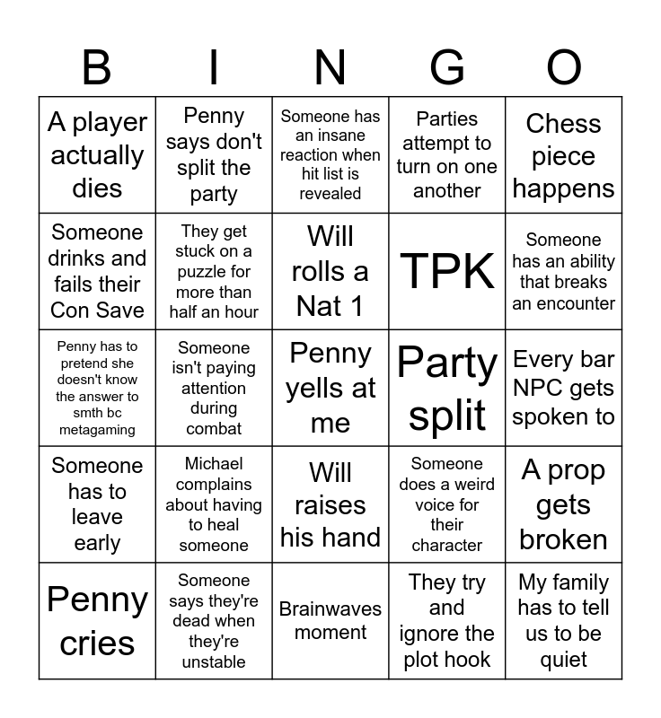 This bingo card has a free space and 24 words: Michael complains about having to heal someone, Someone says they're dead when they're unstable, Will rolls a Nat 1, Penny cries, Chess piece happens, A player actually dies, Someone drinks and fails their Con Save, Penny says don't split the party, Party split, Will raises his hand, TPK, Penny has to pretend she doesn't know the answer to smth bc metagaming, Someone does a weird voice for their character, A prop gets broken, They get stuck on a puzzle for more than half an hour, They try and ignore the plot hook, Every bar NPC gets spoken to, Someone has an insane reaction when hit list is revealed, Someone has an ability that breaks an encounter, Someone isn't paying attention during combat, My family has to tell us to be quiet, Someone has to leave early, Parties attempt to turn on one another and Brainwaves moment.