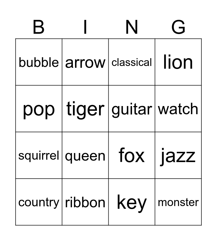 This bingo card has 20 words: jazz, rock, classical, hip hop, country, pop, ribbon, bubble, squirrel, arrow, queen, fox, tiger, monster, guitar, banana, watch, lion, key and watermelon.