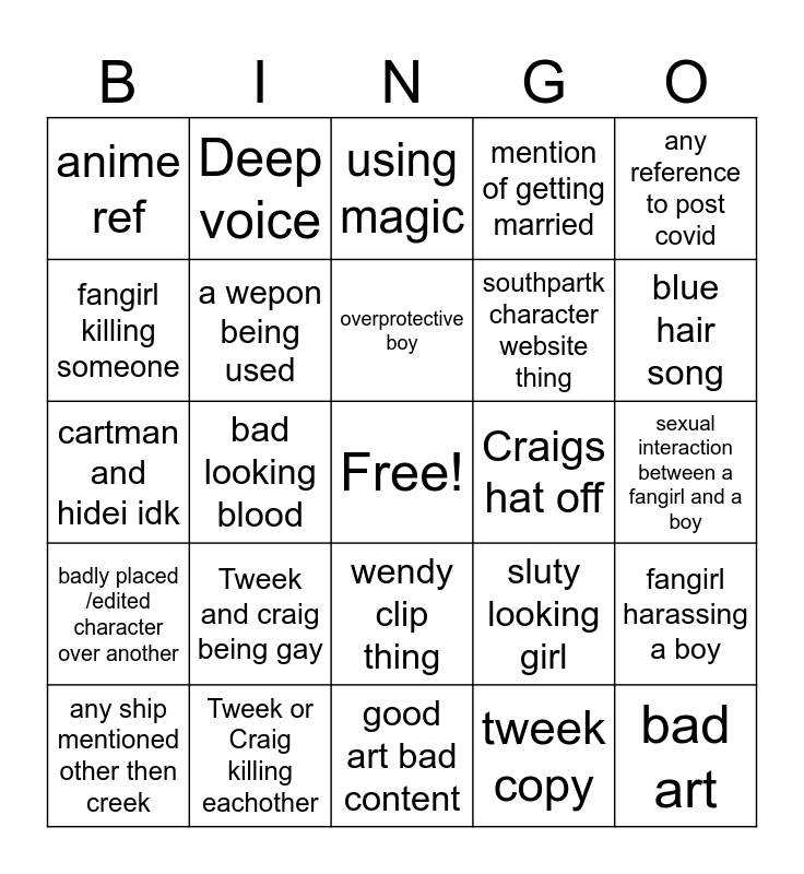 This bingo card has a free space and 24 words: Tweek and craig being gay, Tweek or Craig killing eachother, overprotective boy, any ship mentioned other then creek, any reference to post covid, anime ref, fangirl killing someone, Deep voice, Craigs hat off, wendy clip thing, southpartk character website thing, cartman and hidei idk, sluty looking girl, fangirl harassing a boy, a wepon being used, tweek copy, sexual interaction between a fangirl and a boy, using magic, blue hair song, bad looking blood, bad art, badly placed /edited character over another, mention of getting married and good art bad content.