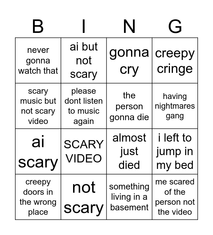 This bingo card has 16 words: not scary, i left to jump in my bed, gonna cry, never gonna watch that, ai scary, ai but not scary, almost just died, something living in a basement, scary music but not scary video, please dont listen to music again, creepy doors in the wrong place, creepy cringe, SCARY VIDEO, having nightmares gang, the person gonna die and me scared of the person not the video.