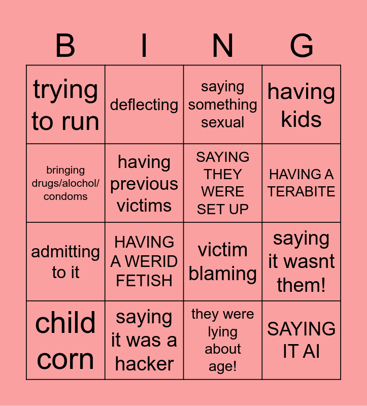 This bingo card has 16 words: saying it was a hacker, saying it wasnt them!, saying something sexual, trying to run, admitting to it, deflecting, victim blaming, they were lying about age!, bringing drugs/alochol/ condoms, having previous victims, child corn, having kids, HAVING A WERID FETISH, HAVING A TERABITE, SAYING THEY WERE SET UP and SAYING IT AI.