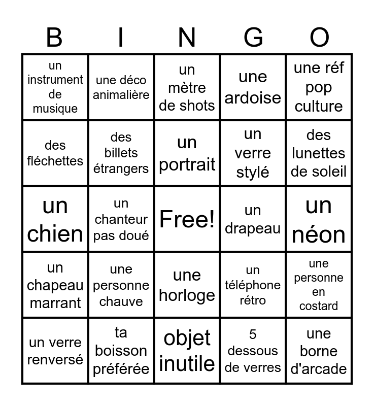 This bingo card has a free space and 24 words: une personne chauve, ta boisson préférée, un portrait, un verre renversé, une réf pop culture, un instrument de musique, des fléchettes, une déco animalière, un drapeau, une horloge, un verre stylé, un chien, un téléphone rétro, une personne en costard, des billets étrangers, 5 dessous de verres, un néon, un mètre de shots, des lunettes de soleil, un chanteur pas doué, une borne d'arcade, un chapeau marrant, une ardoise and objet inutile.